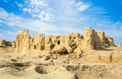 - 지아오허구청(交河故城 교하고성) 투루판시 서쪽 10㎞의 얄내즈고우(雅兒乃孜溝) 30m 절벽의 평평한 마루에 있으며, 남쪽에 얀산(鹽山)이 있고 북쪽에 지오허(交河)가 있으며 지세가 아주 험하다. 주위에 물이 있기 때문에 도시의 형상이 버드나무 가지 같고 물을 중심으로 형성된 땅이며, 남쪽에서 북쪽까지 약 1,650m이고 동서향 제일 넓은 곳이 약 300m인데 항공모함을 닮았다. 지오허구청은 처스치안부(車師前部) 왕국의 국도이고 당나라 유적지이다. 건설 구조가 독특하고, 세계에서 제일 크고 제일 오래되고 제일 잘 보존된 흙 도시다. 3천년의 역사를 갖고 있으며, 당대에는 안서도후부(安石濩府)가 건설되기도 했으며, 13세기에는 몽고의 침략을 받아 약탈되기도 했다. 성은 관부와 민가, 동문, 사원 구역 등으로 잘 구분되어 있다.